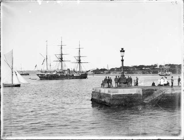 | Top - This photo is off-putting as it distorts the intersection. The telegraph polein Bridge St and it goes up'n'over and continues on to the top right. Meanwhile, Phillip St comes in from cenrtre left and goes out the bottom right (before 1902, sourced from SR-NSW) Bottom Left - This is a Henry King photo held by the PHM and dated 1890. It shows one steam tram going into the yard, and another coming around the corner of the Colonial Secretary's building ready to cut diagonally across the intersection and follow suit. Bottom right - This image is undated, and is sourced from John Cowper's Flickr A/C. We are looking straight up Phillip St (south) and the steam tram is disappearing into the yard on our left. |