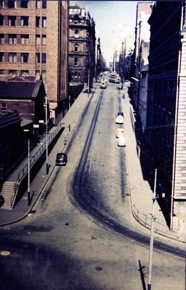 | Steam trams came into the city on their various routes, and had to wait somewhere before the return jpourney. Their crew needed facilities. This yard was their waiting shed. Now Sydney is a very beautiful city, situated as it is on a harbour. But that harbour occupies a drowned valley, a very deep drowned valley. Sydney has been built on all the ridges and valleys that remeined. It is very tortuous. Beautiful, but rugged. Not all lines could adapt to the steam-tram as they were too steep. The Edgecliff to Erskineville Street Wharf tram had to be pulled by cable to get it up and over William Street. |